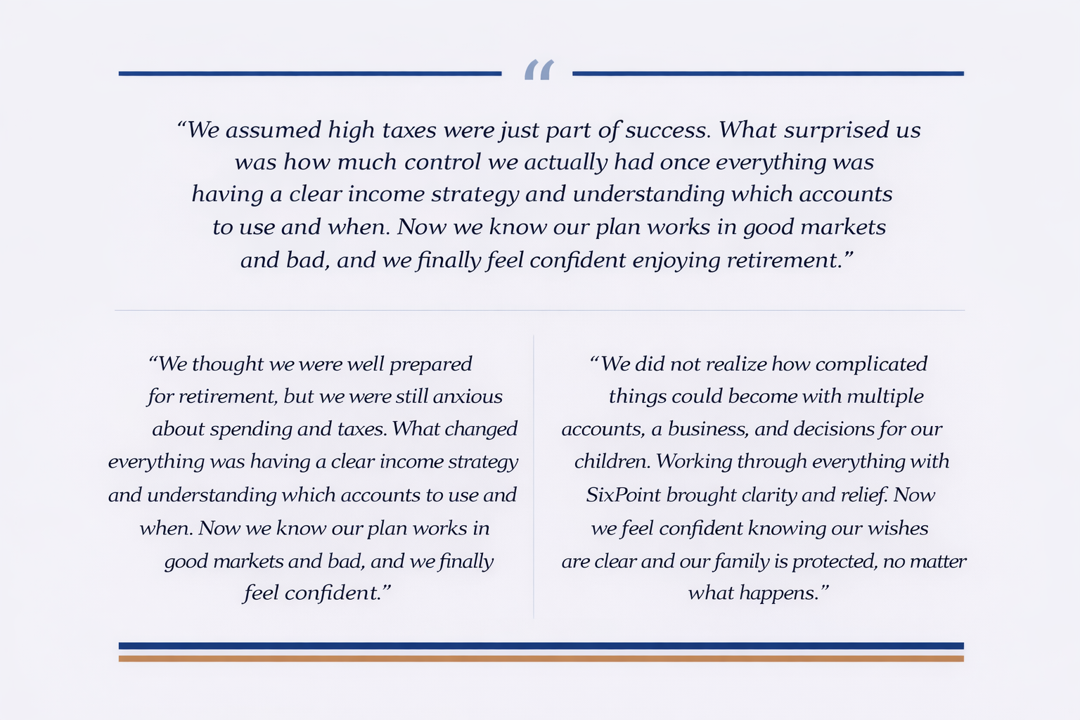 Our process is built around six core areas of financial planning. As independent fiduciaries, we work only for you—delivering objective guidance and a planning process built entirely around your goals. We partner with high net worth families to simplify complexity, protect wealth, and create a clear path forward.